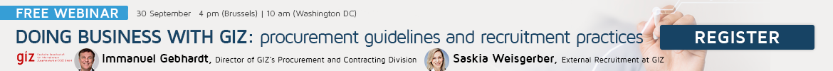 DevelopmentAid is inviting you to attend an exciting webinar on “Doing business with GIZ: procurement guidelines and recruitment practices” that will take place on 30 September 2021 at 4 pm (Brussels Time)/10 am (Washington DC Time).