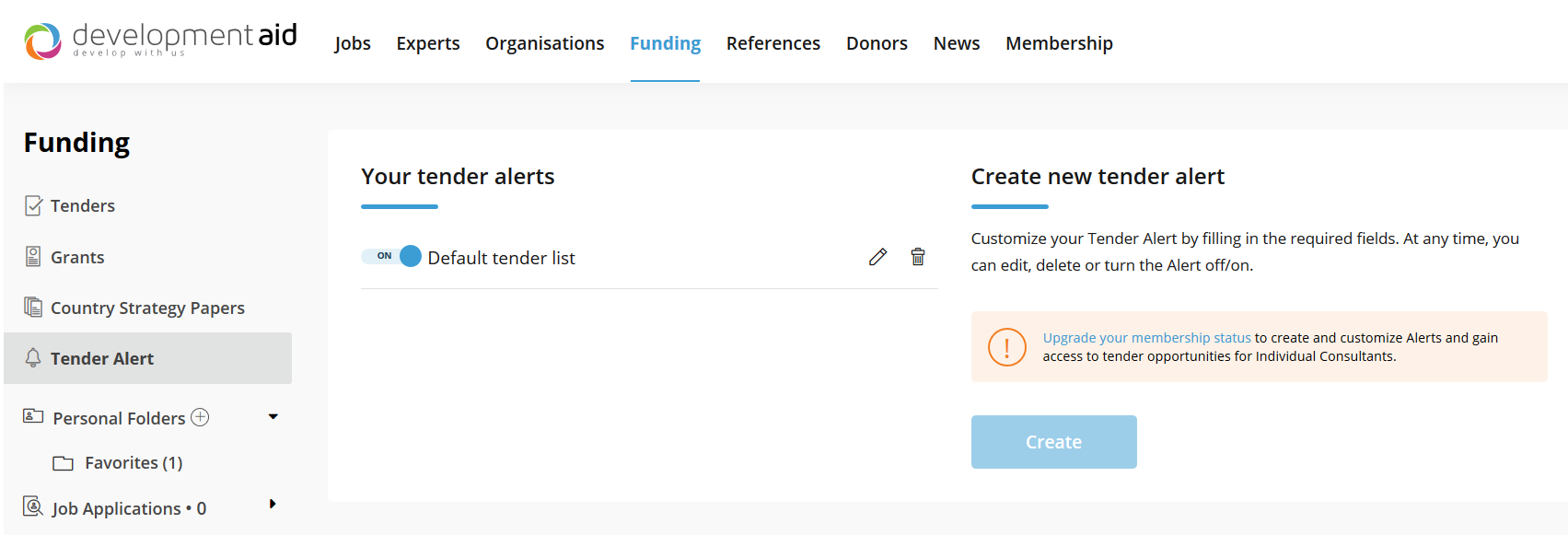 The ‘Tender Alert’ allows you to: update sectors of expertise, choose locations, customize email frequency, select the funding agencies, assign a name to the alert. With just a few simple clicks required to personalize the alert, you will keep up to date with the information that matters the most to you and never miss a relevant consulting opportunity.