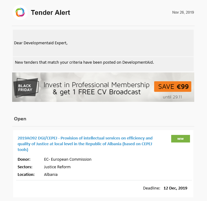 Whether you are regular user or DevAid Basic Member with 10+ years of experience, you will be automatically receiving the ‘Tender Alert’ newsletter in your inbox. The system will select 3 relevant open and 3 forecasted tenders, based on the initial profile information provided by each expert, and send the alert twice a month. As a result, you will save time and won’t need to scroll down the platform in search of information – our system will do all the work for you.