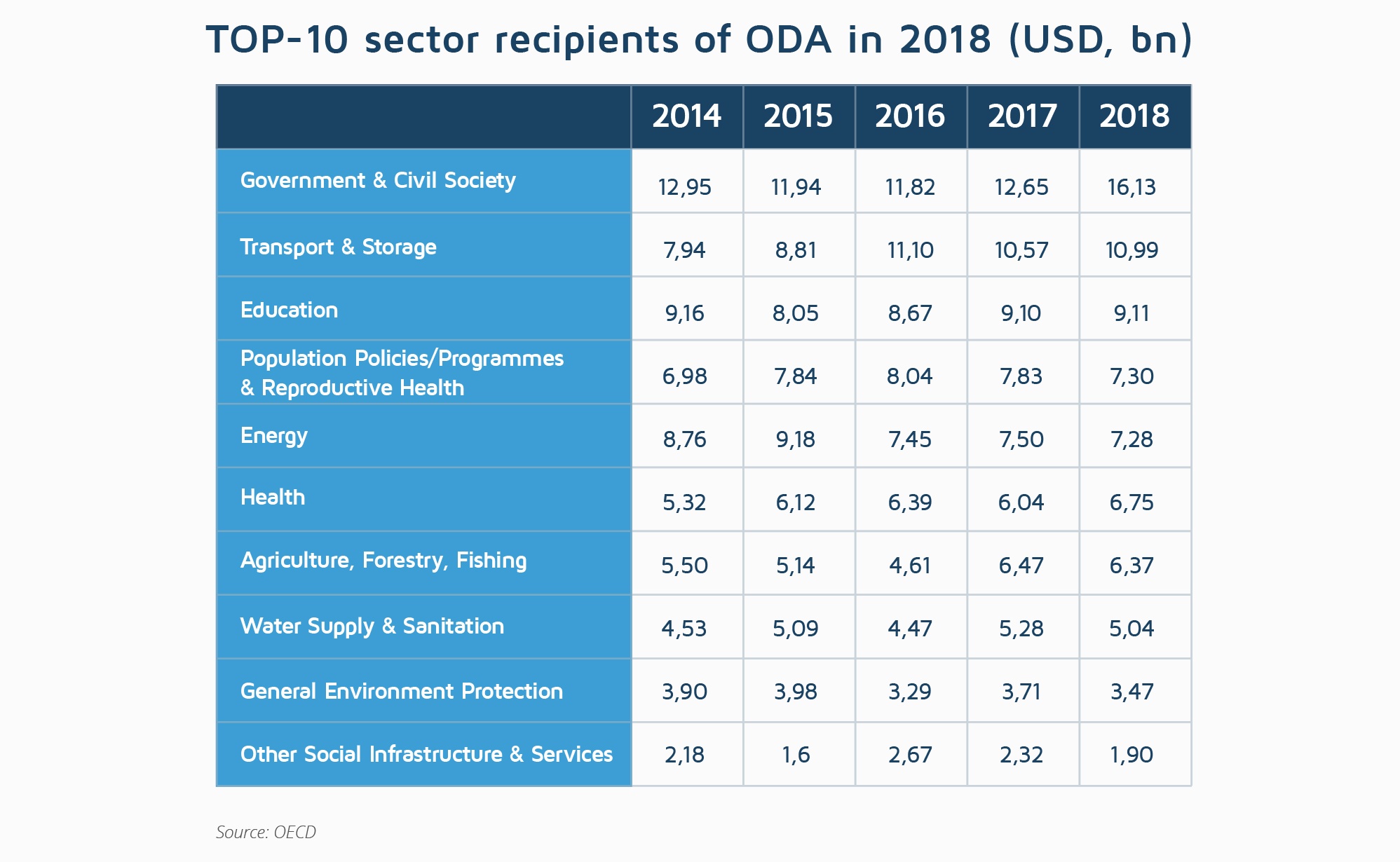Although the commitments to the Economic Infrastructure and Service grouping of sectors remained at the same level of US$21.9 bn. in 2018, when compared to 2017, some of the trends within the sector’s categories are worth highlighting. Thus, the aid flows for the development of communications doubled in 2018, reaching almost US$350 m while the banking and financial services sector dropped by 17% to US$1.8 bn. The same decreasing trend is characteristic of the energy sector where the volume of commitments dropped by 3%, totaling US$7.2 bn in 2018.