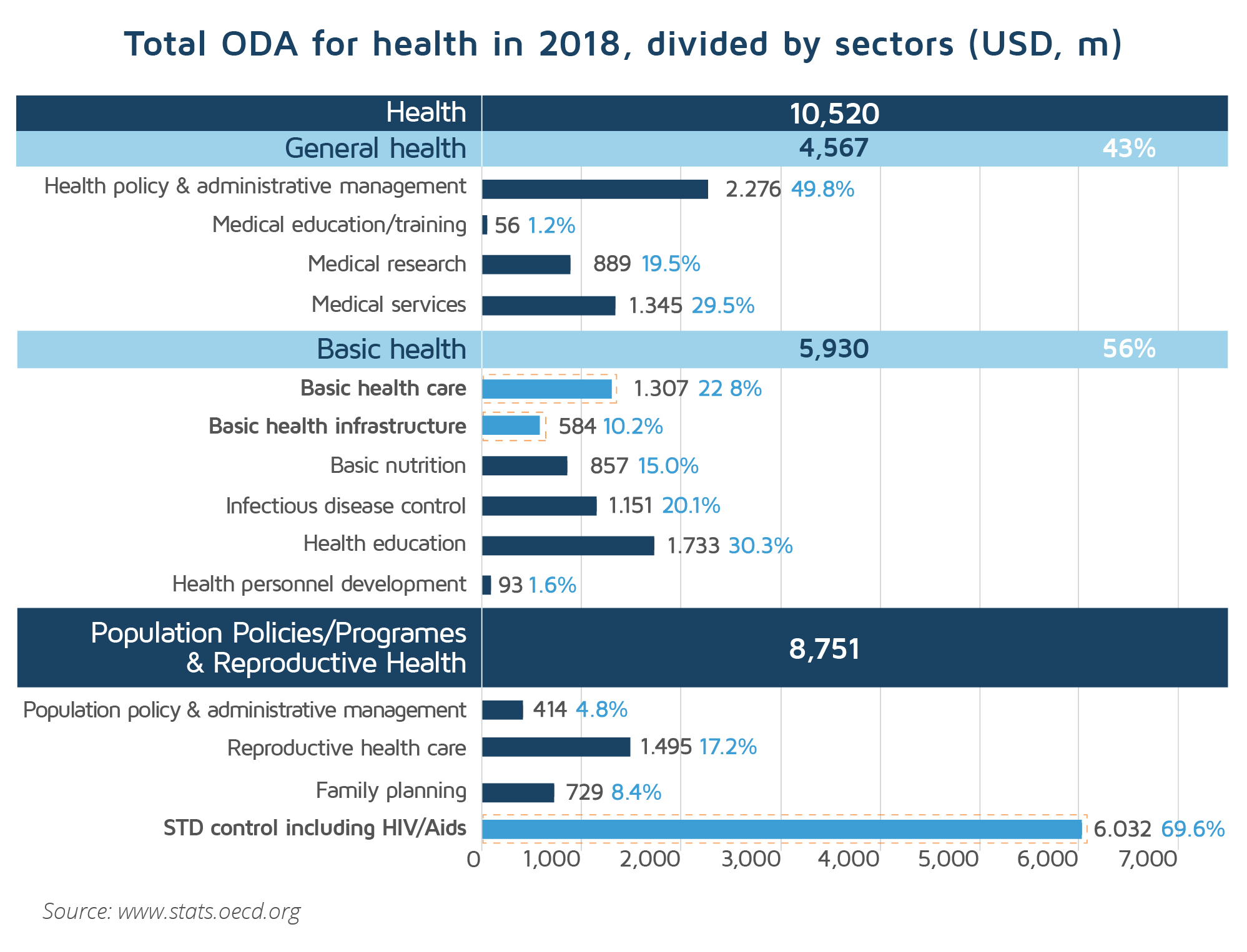 The growth of vertical, disease-specific global health programs has meant that the greatest growth in health aid funding has been related to the control of infectious diseases, particularly HIV/AIDS and malaria. This increasing trend has been evident since 2000, the launch year of the Millennium Development Goals (MDGs). According to the Organization for Economic Cooperation and Development (OECD), the percentage of health ODA allocated to infectious disease control aid (malaria, tuberculosis) has increased from 8% in the period 1990-1998 to 16% in the period of 2005-2008, while basic health infrastructure aid declined from 11% to 5% during 2005-2008. According to OECD data, in 2018 the largest share of global ODA, representing 57%, was allocated to HIV/AIDS control and only 12% and 5.5% were allocated to basic healthcare and healthcare infrastructure respectively.