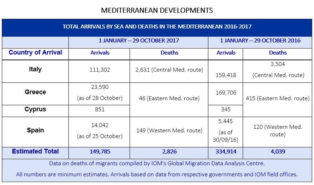 IOM, the UN Migration Agency, reports that 149,785 migrants and refugees entered Europe by sea in 2017 through 29 October, with about 75 per cent arriving in Italy and the remainder divided between Greece, Cyprus and Spain. This compares with 334,914 arrivals across the region through the same period last year.