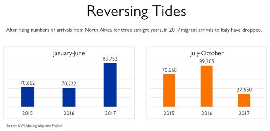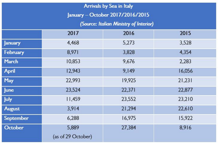 But over the past four months that trend had reversed. During the 2017 months of July-October, IOM has calculated arrivals to Italy fell to 27,550 – well under a third of 2016’s total for those same four months (89,205) well under half of 2015’s total on the Central Mediterranean route (70,658).